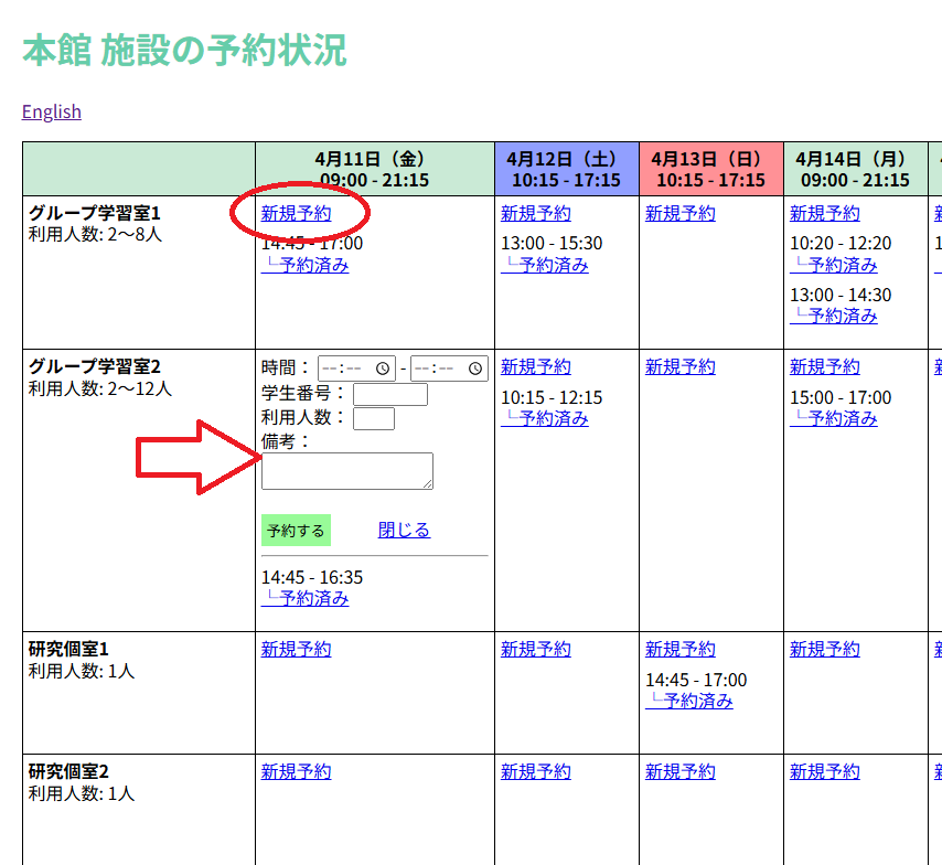 - 各項目を入力し、「予約する」をクリックして予約完了です。特に予約日時や学生番号を間違えないようにしてください。チェックインができなくなります。