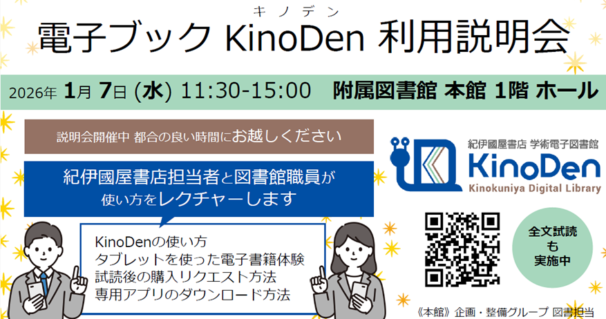 附属図書館本館では、2026年1月7日(水)に電子ブックサービスKinoDenの利用説明会を開催します。